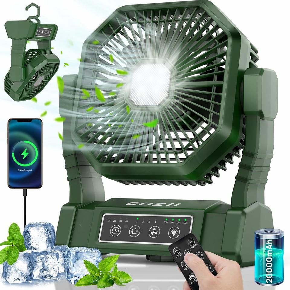 COZII Ventilador Camping Recargable, 20000mAh Ventilador de Mesa, 4 Velocidades Ventilador USB, Ventilador Portátil con Luz LED, Gancho Colgar y Control Remoto.