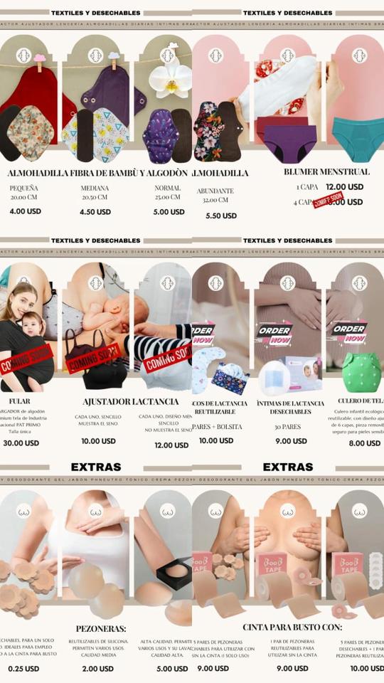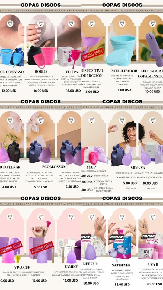 Cuidado menstrual: copas, tampones, toallas, protectores y ropa interior reutilizable.