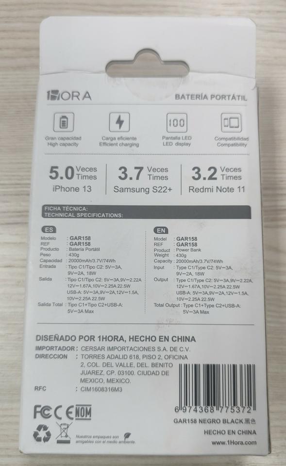 PowerBank 1Hora GAR158 - 20000mAh/22.5W. Nuevo