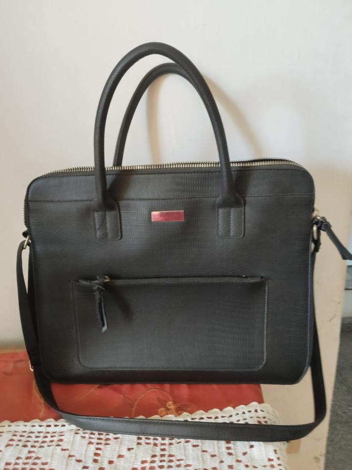 Estilo y Diseño: Elegante bolso/maletín en color negro atemporal. Presenta un acabado texturizado (tipo saffiano o piel labrada) y detalles metálicos sutiles en color oro rosa o plateado, que le dan un toque profesional.