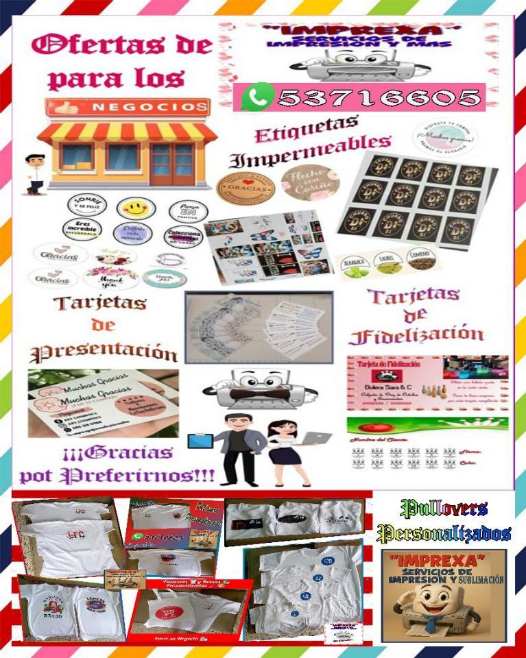 También ofrecemos otros servicios: Artículos Personalizados (Pullovers en Blanco y en Negro, Jarras de Cerámica,Cojines,Mouse Pad, Bolsas de tela); Tarjetas de Presentación/Fidelidad, Etiquetas para sus productos (impermeables y listas para despegar x UD), Impresión de Fotos (Papel Profesional).