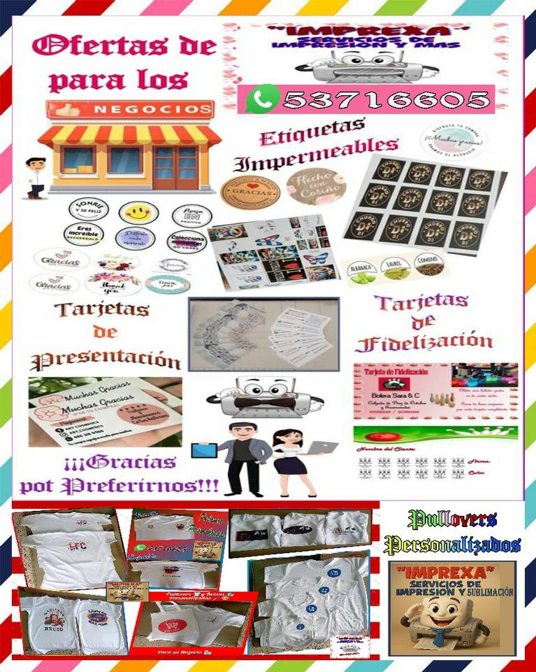 También prestamos el servicio de Tarjetas de Presentación/Fidelidad (Diseño e Impresión), Pullovers Personalizados (en color blanco cualquier diseño y en negro solo logos/textos/figuras en blanco y gris plateado) y otros Artículos (Jarras de Cerámica, Cojines, Bolsas de Tela y Mouse Pad). Así como Impresión de Fotos (papel profesional) y en Cartulina.