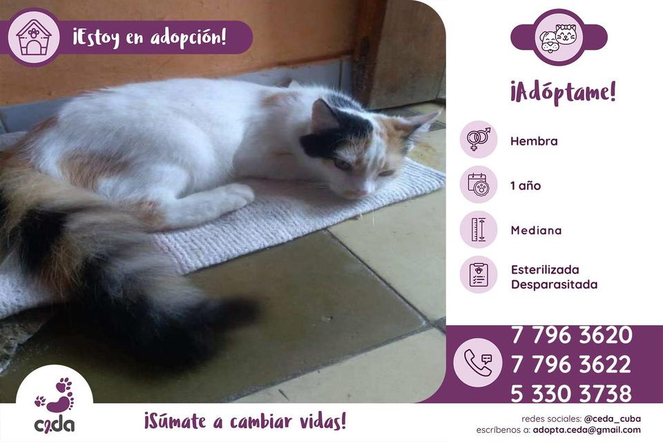 Ella vive con una señora de 85 años que no puede valerse por si sola, está muy mayor, y va a ser trasladada a casa de su familia. Tristemente no puede llevarse a la gatita a este nuevo hogar, por lo que ella busca una familia. Bríndale tu hogar y disfruta de la presencia mágica de un gato. Llama a Nathalie al 77963620, 77963622 o 53303738.