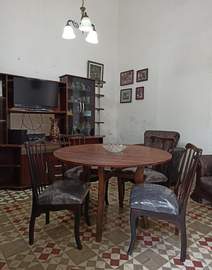 Mesa circular de 1.20 m de diámetro y cuatro sillas de estilo mid-century recién tapizadas.