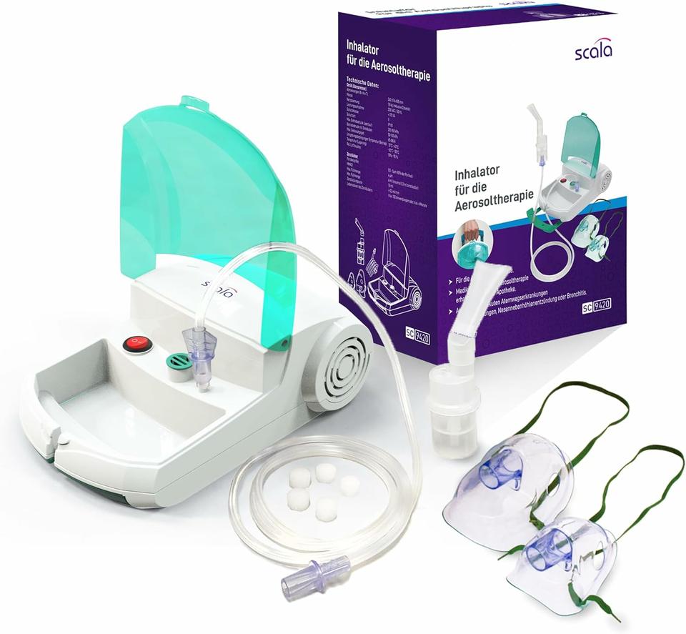 El inhalador scala SC 9420 con su compresor y nebulizador RF Plus es un sistema de inhalación eficaz para el uso de aerosoles medicinales en el tratamiento de enfermedades de las vías respiratorias superiores e inferiores. El inhalador SC 9420 es un dispositivo compacto de sobremesa con conexión a la red eléctrica. El tamaño de las partículas depende de la viscosidad del medicamento. Según la MMAD (EN 13554-1), el tamaño medio de las partículas es de 4 µm. La fracción respirable a <5,0 µm es del 80%.